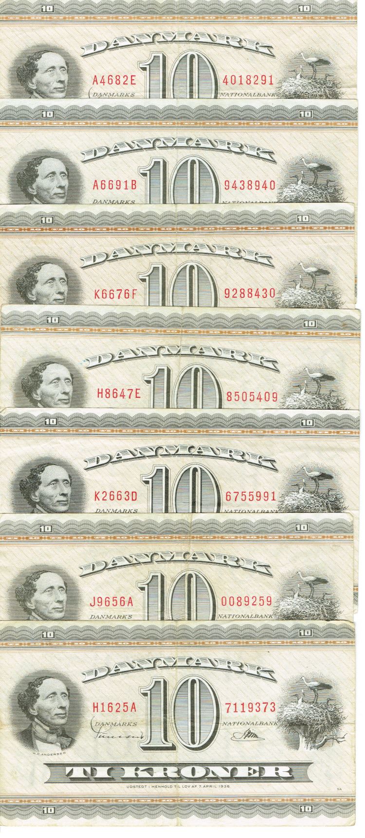 Seddel: 10 kr. 1962 - 1969 omkring kv. 1 - 1+ 7 stk.