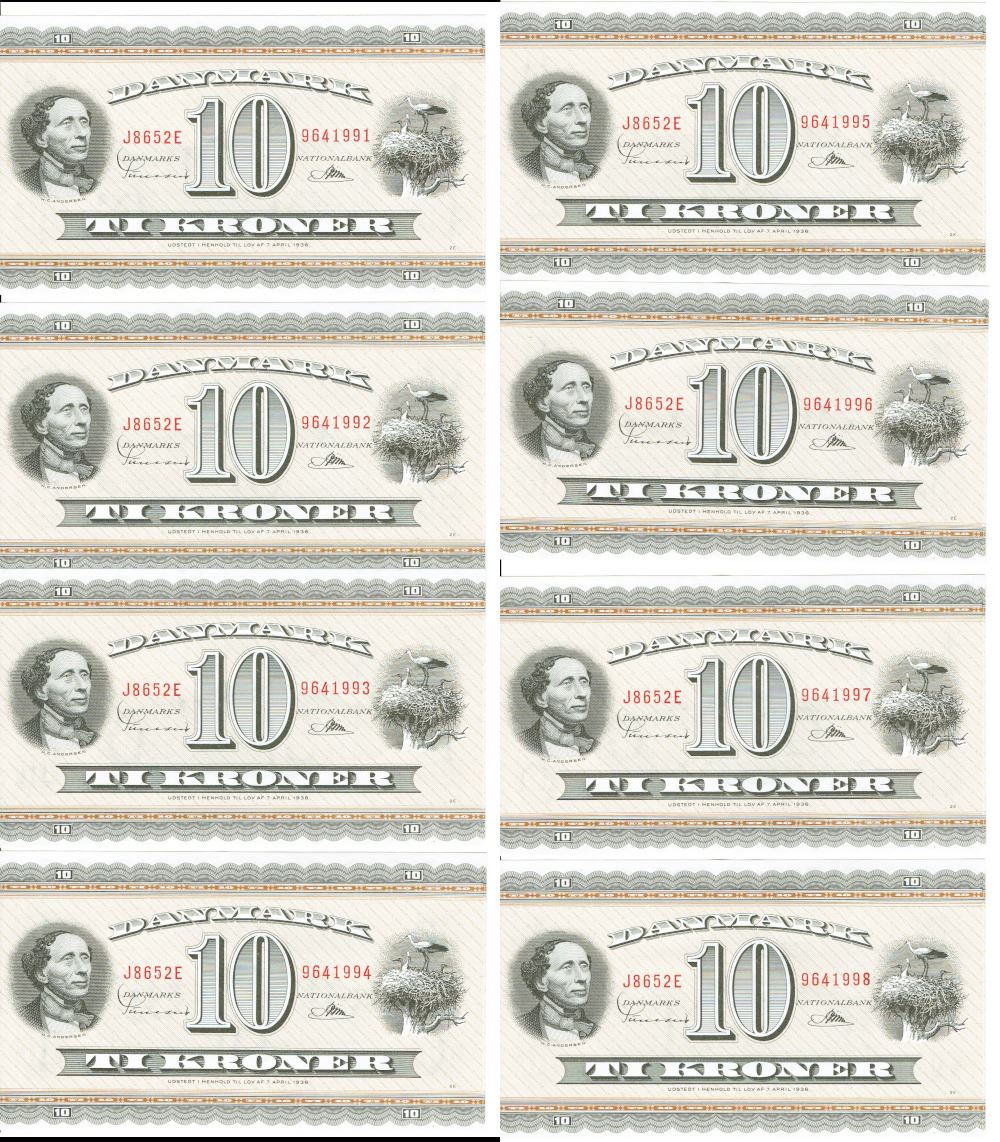 Seddel: 10 kr. 1965 J8652E i kv. 0 8 stk. fortløbende nr.