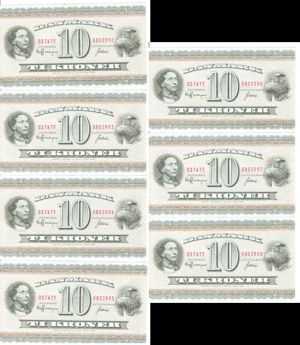 Seddel: 10 kr. 1974 D3747F i kv. 0 7 stk. fortløbende nr.
