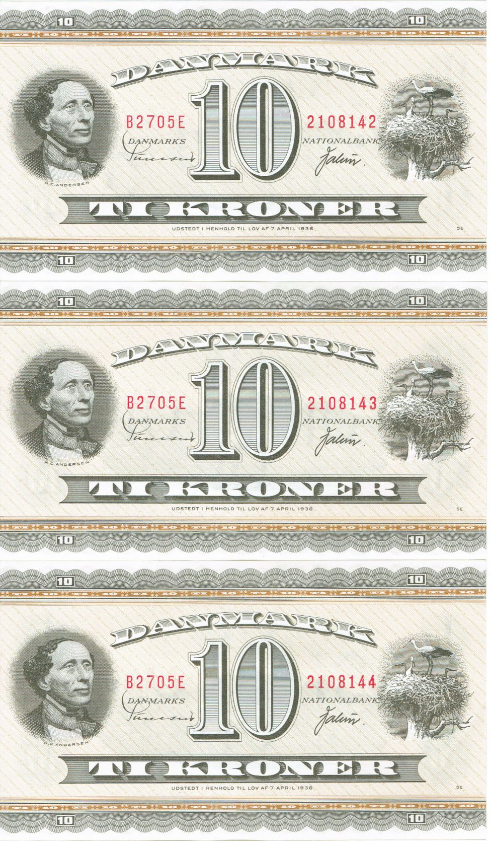 Seddel: 10 kr. 1970 B2705E i kv. 0 3 stk. fortløbende nr.