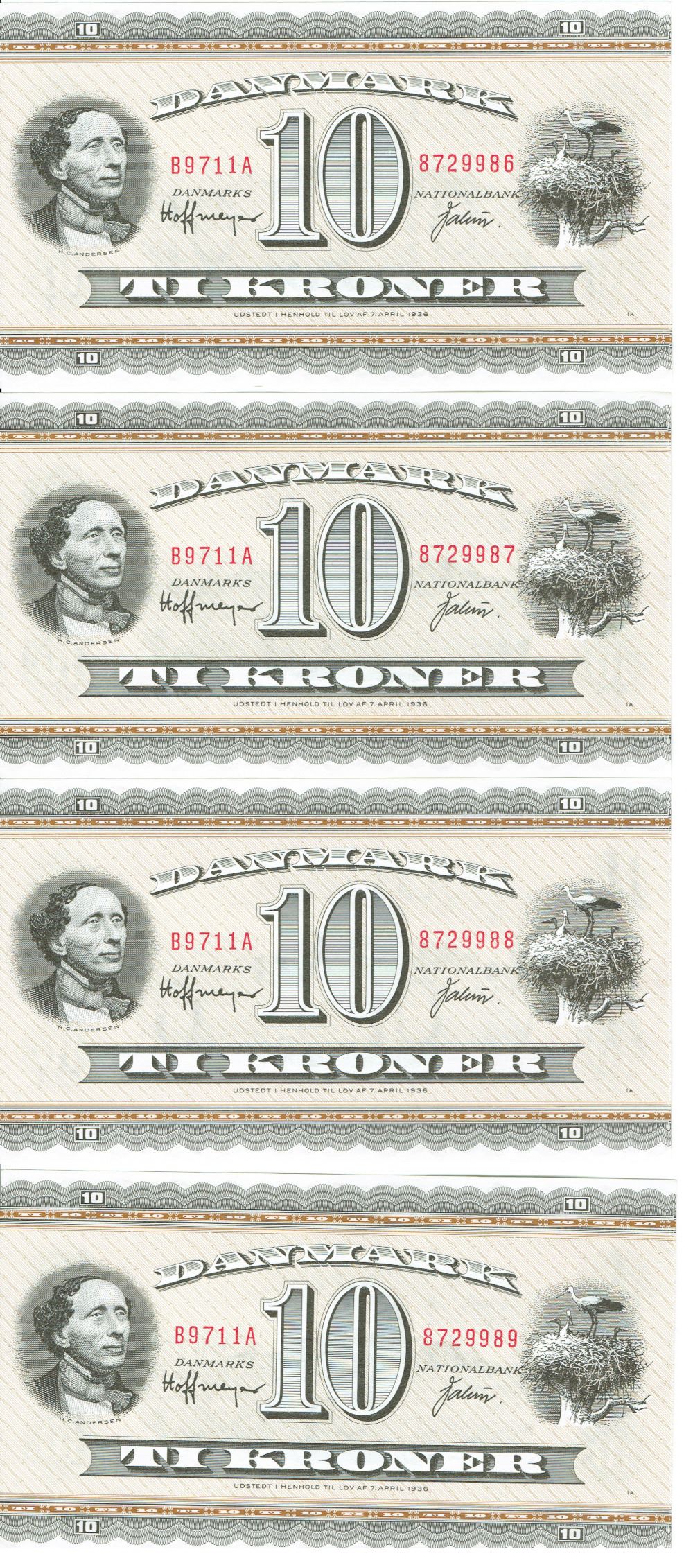 Seddel: 10 kr. 1971 B9711A i kv. 0 4 stk. fortløbende nr.