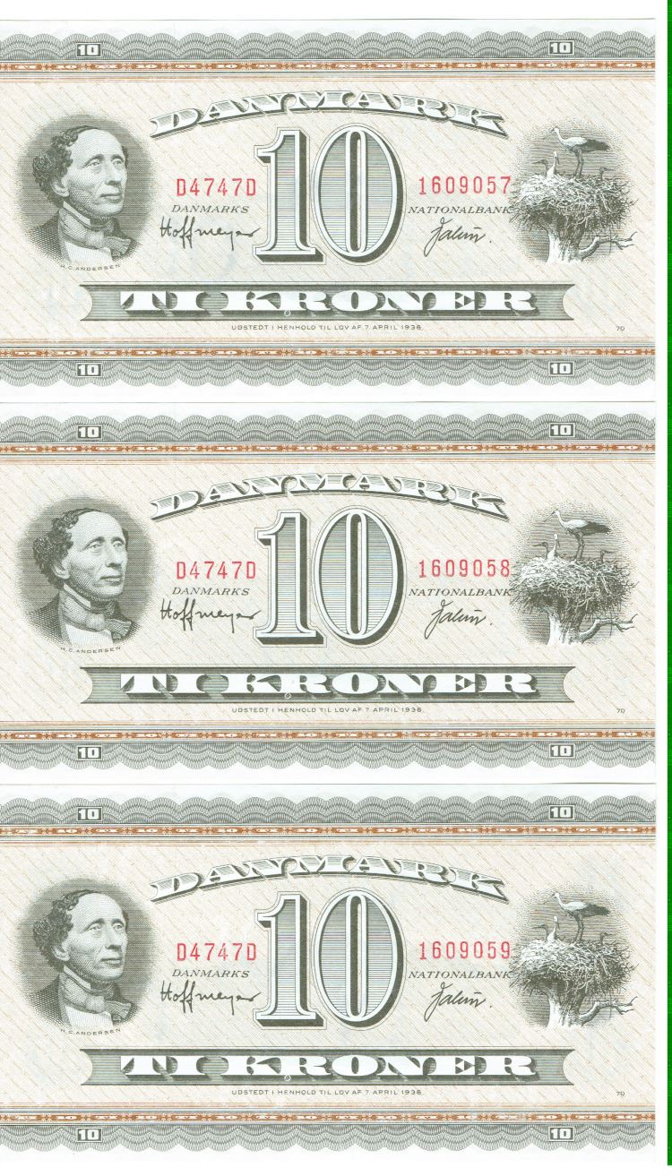 Seddel: 10 kr. 1974 D4747D i kv. 0 3 stk. fortløbende nr.