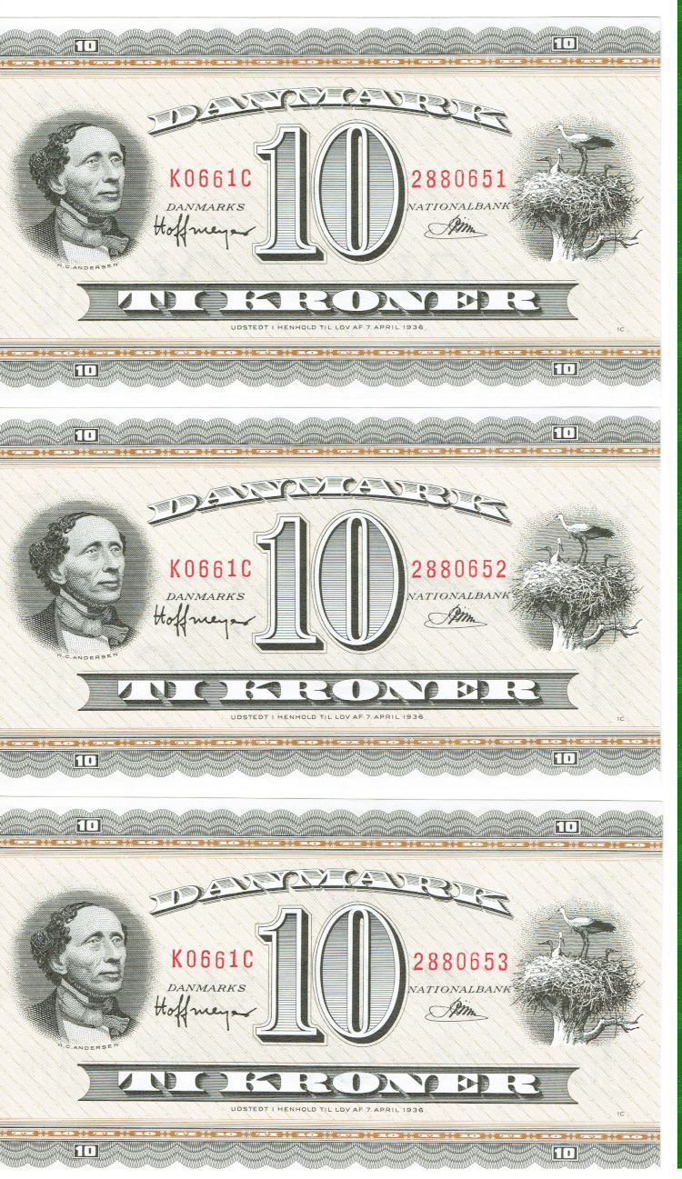 Seddel: 10 kr. 1966 K0661C i kv. 0 3 stk. fortløbende nr.
