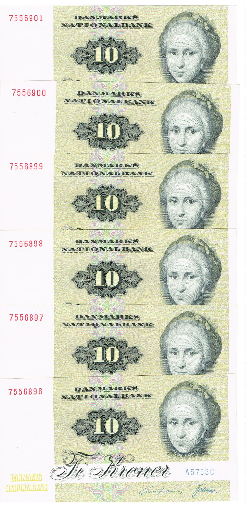 Seddel: 10 kr. 1975 A5753 i kv. 01 - 0 6 stk. fortløbende nr.
