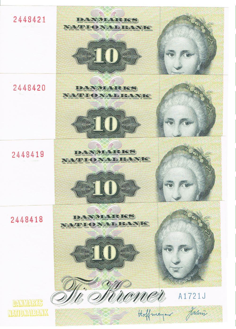 Seddel: 10 kr. 1972 A1721 i kv. 0 4 stk. fortløbende nr.