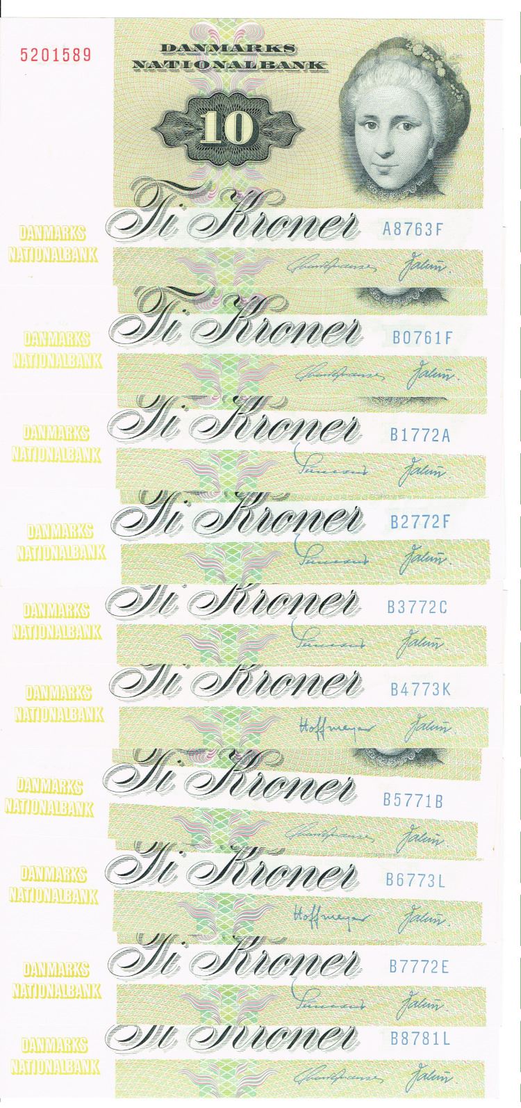 Seddel: 10 kr. 1976 - 1978 10 stk. med forskellige litra i kv. 01 og 01 - 0