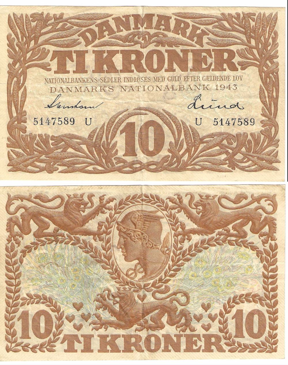 Seddel: 10 kr. 1943 bogstav U i kv. 1+