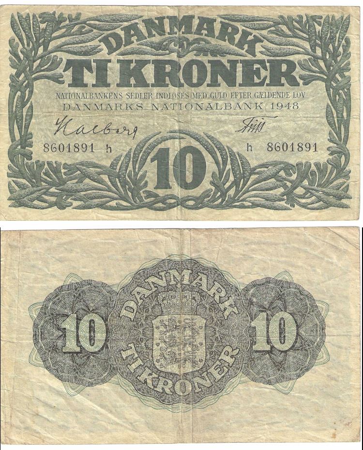 Seddel: 10 kr. 1948 bogstav h i kv. 1