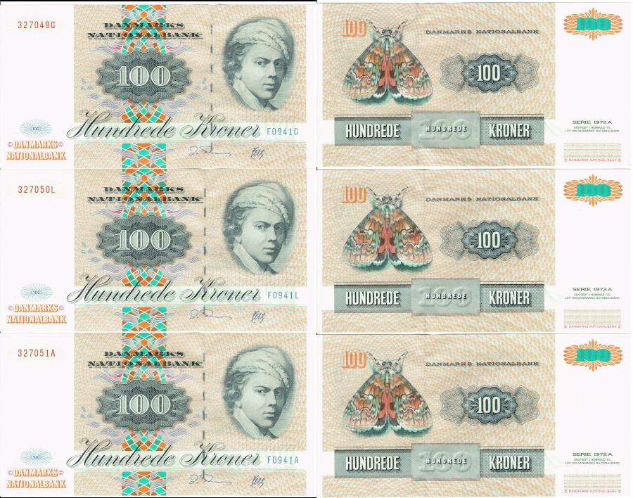 Seddel: 100 kr. 1994 F0941G i kv. 0 3 stk. fortløbende nr.