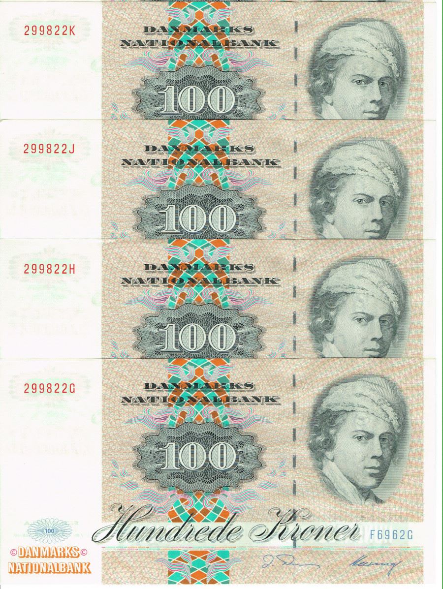 Seddel: 100 kr. 1996 F6962 i kv. 0 4 stk. fortløbende nr.