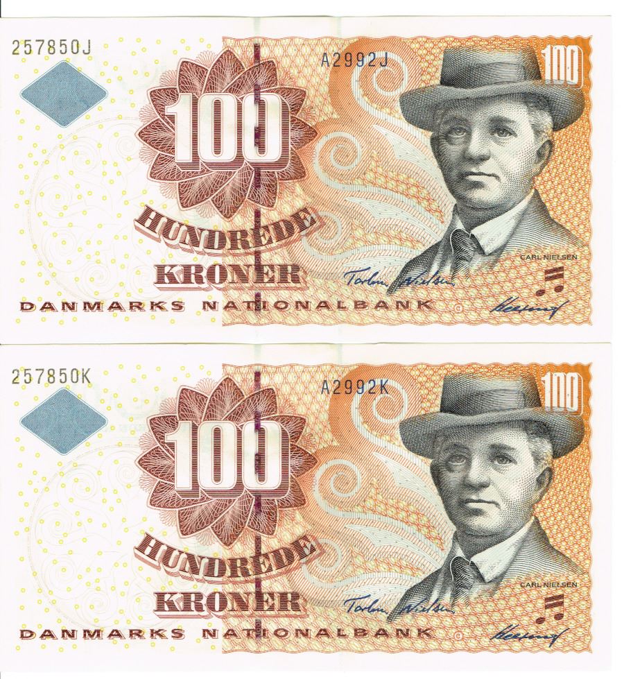 Seddel: 100 kr. 1999 A2992 i kv. 0 2 stk. med serienr. 0J og 0K