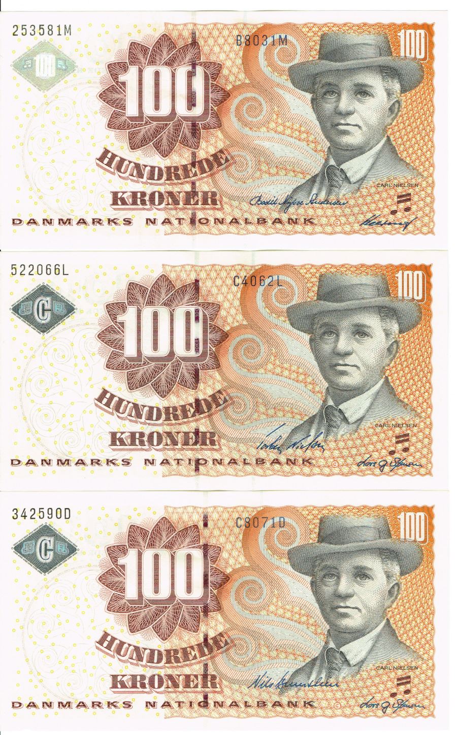 Seddel: 100 kr. 2003 - 2007 i kv. 0 3 stk. litra B8, C4 og C8
