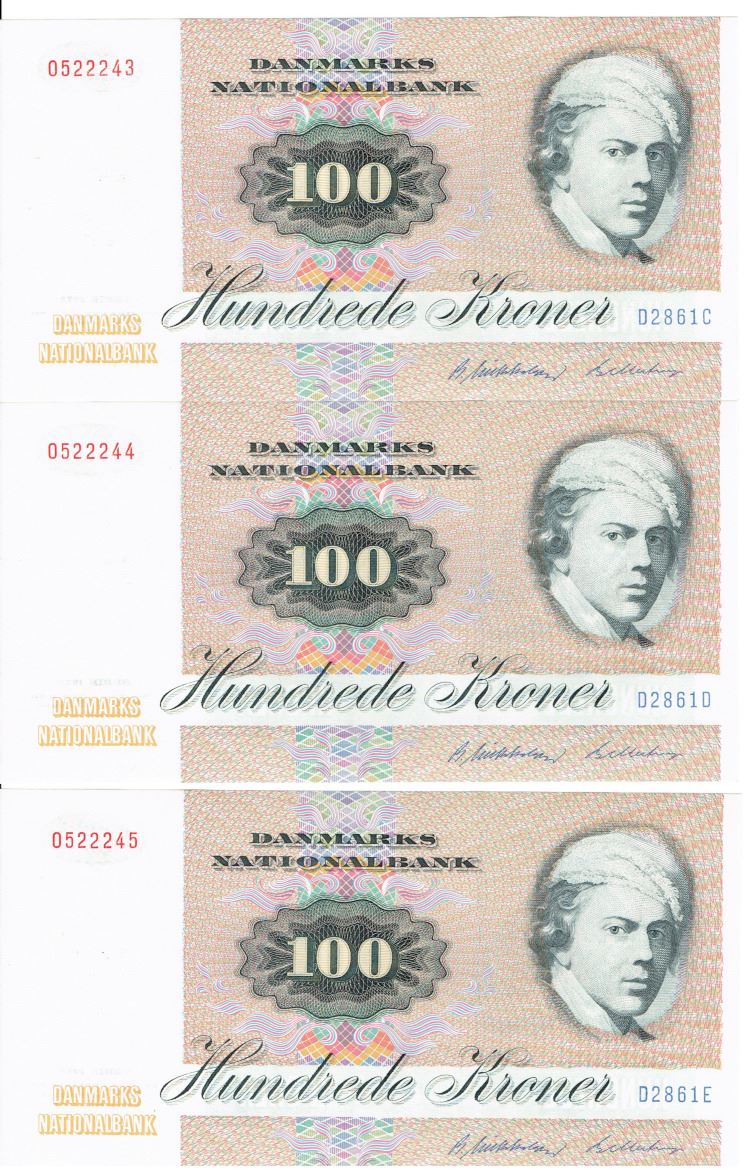 Seddel: 100 kr. 1986 D2861 i kv. 0 3 stk. fortløbende nr.