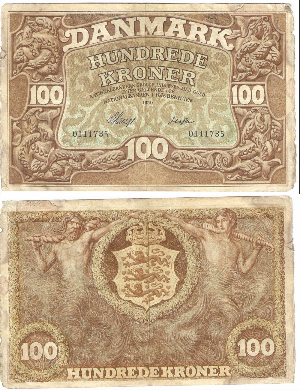 Seddel: 100 kr. 1930 uden bogstav i kv. 1+