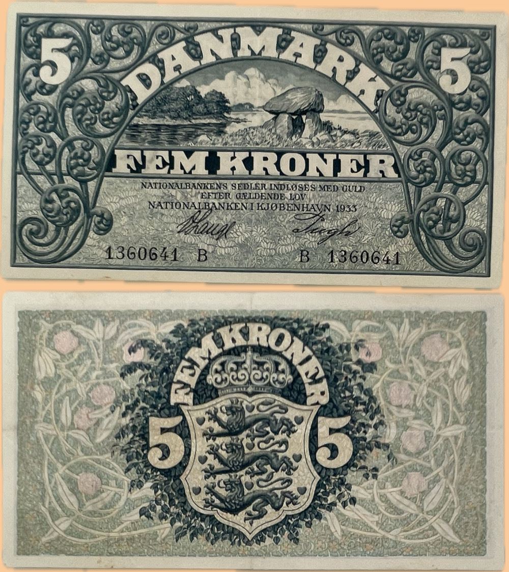 Seddel: 5 kr. 1933 bogstav B i kv. 1+