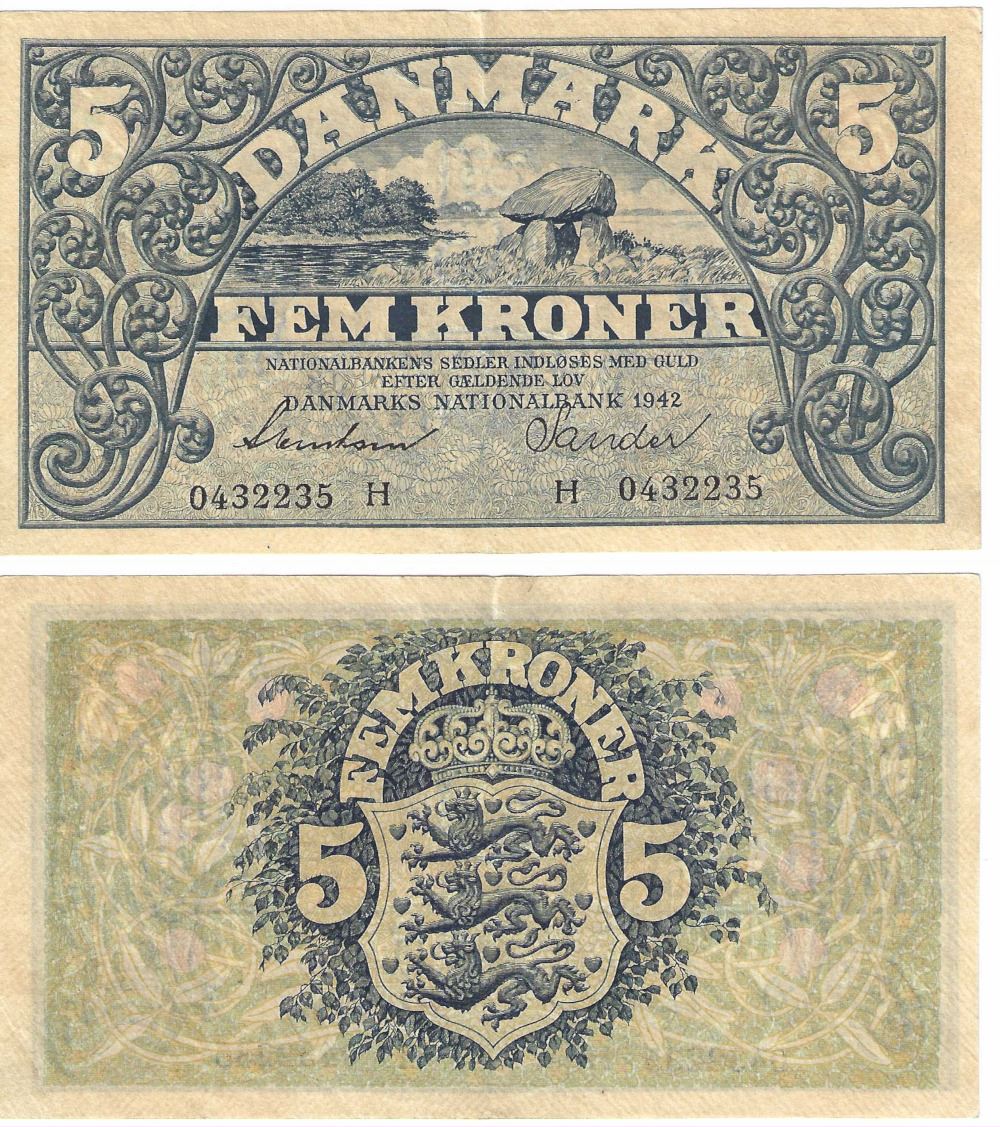 Seddel: 5 kr. 1942 bogstav H i kv. 01