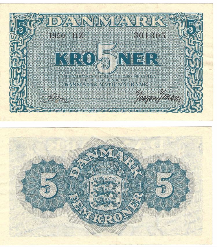 Seddel: 5 kr. 1950 bogstav DZ i kv. 01 - 0